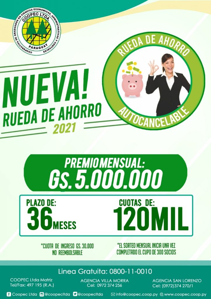 Hacemos extensiva la invitación para que adquieras tu lugar para el sorteo mensual de la Rueda de Ahorros. Últimos lugares disponibles!Contactar con: Lic. Leticia Centurión Tel: (021) 497-195 Interno: 115Celular: (0976)567-661