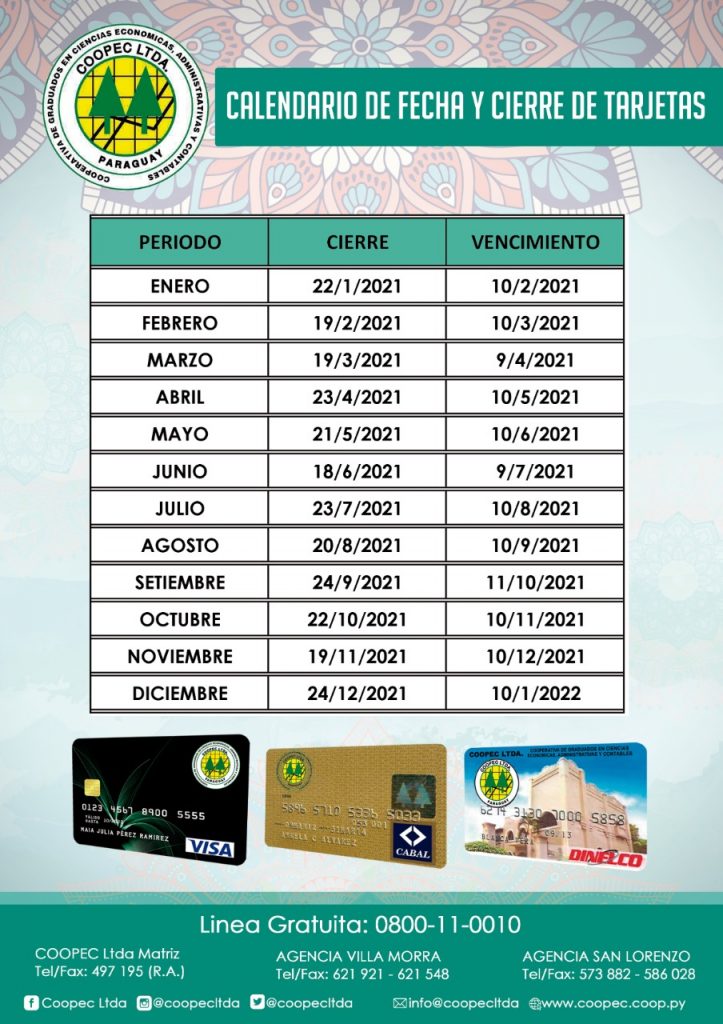 Ponemos a su disposición el calendario de fechas de CIERRE y VENCIMIENTO de las tarjetas de crédito COOPEC para el ejercicio 2021. Para mayor información no dude en contactarnos.