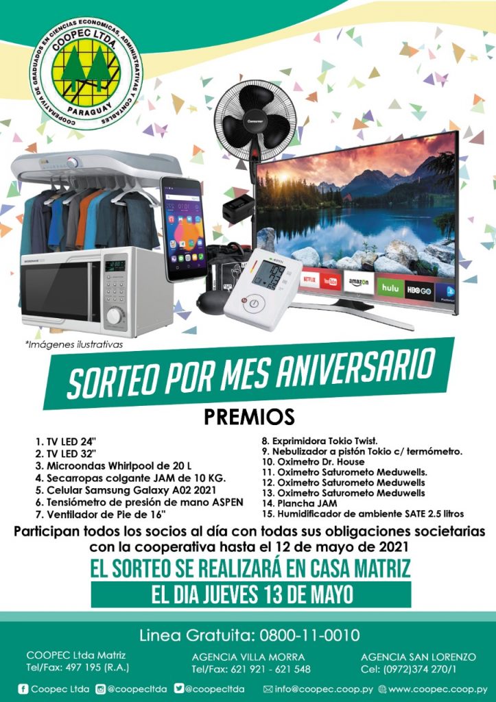 Participá de los sorteos por el mes aniversario de la cooperativa poniéndote al día con todas tus obligaciones societarias hasta el 12 de mayo del 2021.